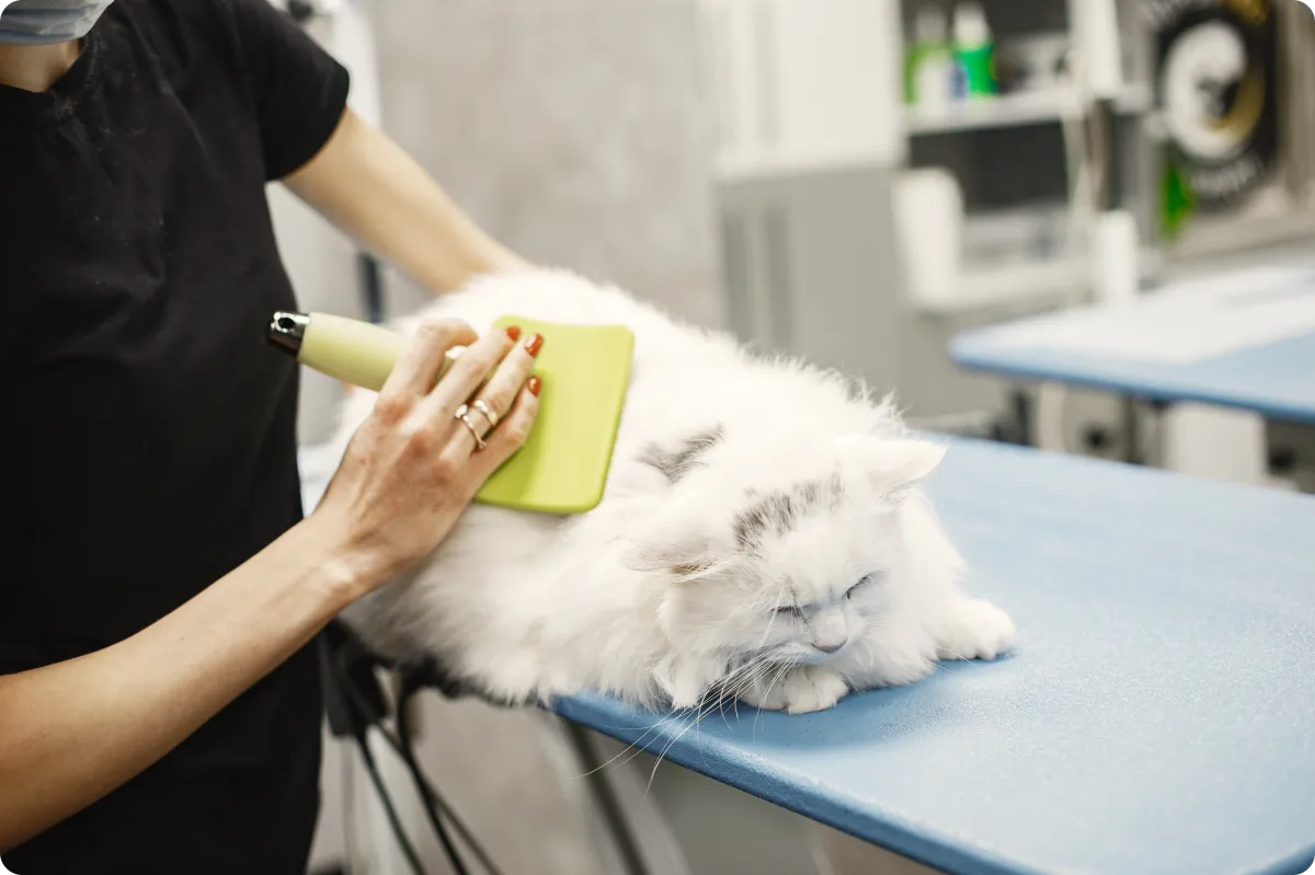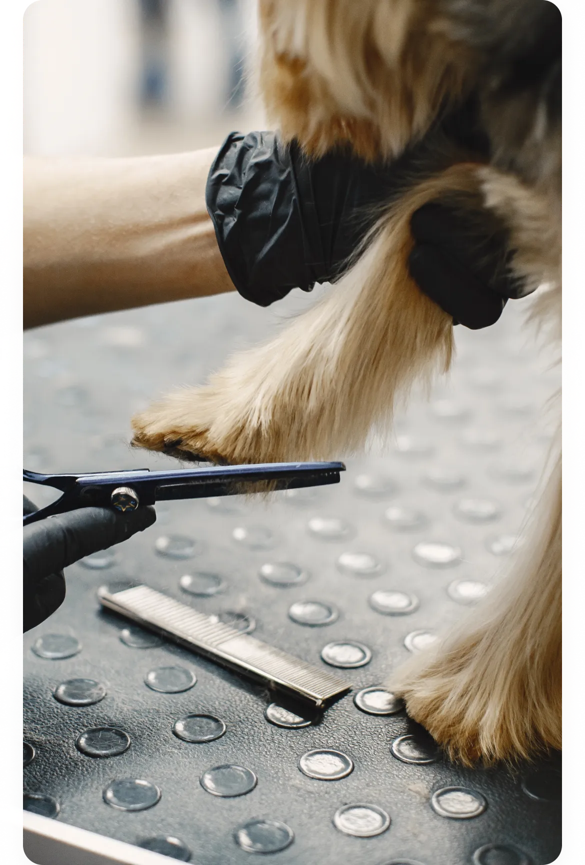 We offer a wide range of grooming services including bathing, haircuts, nail trimming, ear cleaning, and teeth brushing. We also offer specialized services like flea treatments, de-shedding, and skin care for pets with special needs.